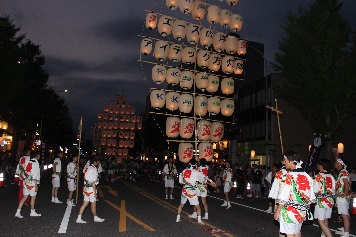 間近で見ると凄い迫力ですが、提灯がつくとさらに重たい万灯を上げる担ぎ手さんはすごいです!